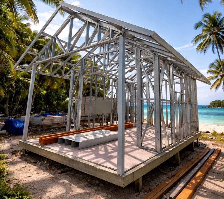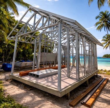Solutions de conception et fourniture de structures en acier léger galvanisé, intégrant la supply chain des matériaux et du mobilier, pour des projets durables en environnements contraints : humidité, corrosion saline, vents cycloniques et logistique insulaire.